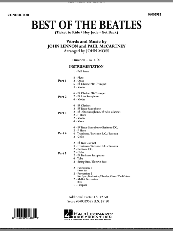 Digital sheet music for concert band, complete collection, flex band. Look at what parts are included below to understand exactly the instrumentation of this piece. More info from the publisherPublisher: Hal LeonardContributors to this music title:John Lennon (composer)John Moss (arranger, writer)The Beatles (writer)This item includes: PDF (digital sheet music to download and print)Instrumentation:concert bandSkill Level:intermediateGenre:popTotal Pages:73