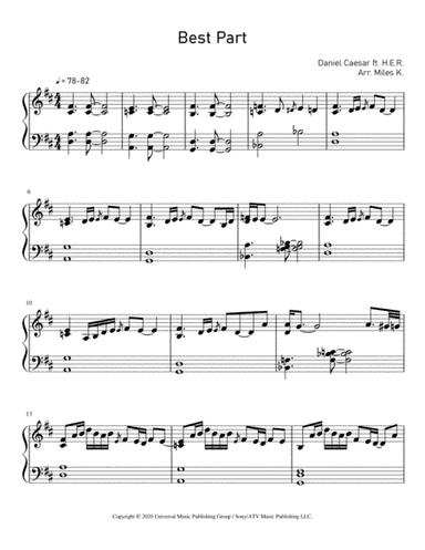 Harp - Level 3 - Digital Download SKU: A0.836278 By Daniel Caesar. By Ashton Simmonds, Gabriella Wilson, Jordan DC Evans, Jordan Evans, Matthew Burnett, Matthew Burnette, and Riley Bell. Arranged by Rena Ng. Contemporary,Wedding. Score. 4 pages. Rena Ng #6442203. Published by Rena Ng (A0.836278). A harp solo arrangement of Best Part by Daniel Caesar feat. H.E.R. Suitable for a wedding performance. Recommended for intermediate to advanced intermediate level players on both lever (tuned in Eb major) and pedal harps. Only lever change markings are indicated.Key: C majorLever/Pedal changes: Eb, Ab, BbRange: C6 – E2It can also be played on the piano.Find more arrangements and videos at https://harpwithme.com This product was created by a member of ArrangeMe, Hal Leonard's global self-publishing community of independent composers, arrangers, and songwriters. ArrangeMe allows for the publication of unique arrangements of popular titles and original compositions from a variety of voices and backgrounds. The length, difficulty, and retail pricing are determined solely by the discretion of the person who arranged or composed it. About Digital Downloads Digital Downloads are downloadable sheet music files that can be viewed directly on your computer, tablet or mobile device. Once you download your digital sheet music, you can view and print it at home, school, or anywhere you want to make music, and you don’t have to be connected to the internet. Just purchase, download and play! PLEASE NOTE: Your Digital Download will have a watermark at the bottom of each page that will include your name, purchase date and number of copies purchased. You are only authorized to print the number of copies that you have purchased. You may not digitally distribute or print more copies than purchased for use (i.e., you may not print or digitally distribute individual copies to friends or students).