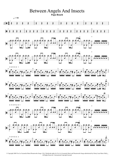 Drums - Level 3 - Digital Download SKU: A0.1283922 By Papa Roach. By Papa Roach. Arranged by Cyril Mayer. 21st Century,Rock. Score. 3 pages. Cyril Mayer #875104. Published by Cyril Mayer (A0.1283922). Between Angels And Insects - Papa Roach - Drum Transcript. This product was created by a member of ArrangeMe, Hal Leonard’s global self-publishing community of independent composers, arrangers, and songwriters. ArrangeMe allows for the publication of unique arrangements of both popular titles and original compositions from a wide variety of voices and backgrounds. About Digital Downloads Digital Downloads are downloadable sheet music files that can be viewed directly on your computer, tablet or mobile device. Once you download your digital sheet music, you can view and print it at home, school, or anywhere you want to make music, and you don’t have to be connected to the internet. Just purchase, download and play! PLEASE NOTE: Your Digital Download will have a watermark at the bottom of each page that will include your name, purchase date and number of copies purchased. You are only authorized to print the number of copies that you have purchased. You may not digitally distribute or print more copies than purchased for use (i.e., you may not print or digitally distribute individual copies to friends or students).