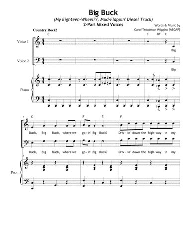 Choral Choir (SA) - Level 2 - Digital Download SKU: A0.727281 Composed by Carol Troutman Wiggins. Children,Comedy,Country,Instructional,Rock. Octavo. 17 pages. Carol Troutman Wiggins #3430817. Published by Carol Troutman Wiggins (A0.727281). BIG BUCK (My Eighteen-Wheelin', Mud-Flappin' Diesel Truck) 2-Part Mixed VoicesThis is that "different" high-energy song for the guys (and girls!) that you have been looking for!!! Written especially in the interest of young male singers, this upbeat, foot-stomping country song about an eighteen-wheeler is sure to please all of your truck lovers, girls or boys! (And . . . it's not about a pirate! Ha!)Excellent for upper elementary, middle school, and high school male voicesKey of C - shouldn't be too high or too low for any voice rangeA bit wordy, but has a great description of a truck driver's lifeLot of eighth notes and intervals of 4ths & 5thsAdd thigh slaps (or hand claps)Some spoken passagesUse of fermatasOptional action cues included in scoreChords included for additional instrumentsAdd guitar, bass, fiddle, and drums for a make-shift country band. This product was created by a member of ArrangeMe, Hal Leonard’s global self-publishing community of independent composers, arrangers, and songwriters. ArrangeMe allows for the publication of unique arrangements of both popular titles and original compositions from a wide variety of voices and backgrounds. About Digital Downloads Digital Downloads are downloadable sheet music files that can be viewed directly on your computer, tablet or mobile device. Once you download your digital sheet music, you can view and print it at home, school, or anywhere you want to make music, and you don’t have to be connected to the internet. Just purchase, download and play! PLEASE NOTE: Your Digital Download will have a watermark at the bottom of each page that will include your name, purchase date and number of copies purchased. You are only authorized to print the number of copies that you have purchased. You may not digitally distribute or print more copies than purchased for use (i.e., you may not print or digitally distribute individual copies to friends or students).