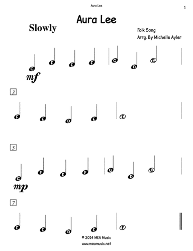 Piano Solo - Level 1 - Digital Download SKU: A0.768414 Composed by Folk Song. Arranged by Michelle Ayler. Folk,Instructional. Score. 1 pages. MEA Music #3874575. Published by MEA Music (A0.768414). Late Elementary Piano Solo. Contact (Questions, Requests, Comments, Collaborations) Twitter: https://twitter.com/meamusiccatalog Facebook: https://www.facebook.com/meamusicsheets Website: https://meamusic.net/ This product was created by a member of ArrangeMe, Hal Leonard's global self-publishing community of independent composers, arrangers, and songwriters. ArrangeMe allows for the publication of unique arrangements of popular titles and original compositions from a variety of voices and backgrounds. The length, difficulty, and retail pricing are determined solely by the discretion of the person who arranged or composed it. About Digital Downloads Digital Downloads are downloadable sheet music files that can be viewed directly on your computer, tablet or mobile device. Once you download your digital sheet music, you can view and print it at home, school, or anywhere you want to make music, and you don’t have to be connected to the internet. Just purchase, download and play! PLEASE NOTE: Your Digital Download will have a watermark at the bottom of each page that will include your name, purchase date and number of copies purchased. You are only authorized to print the number of copies that you have purchased. You may not digitally distribute or print more copies than purchased for use (i.e., you may not print or digitally distribute individual copies to friends or students).