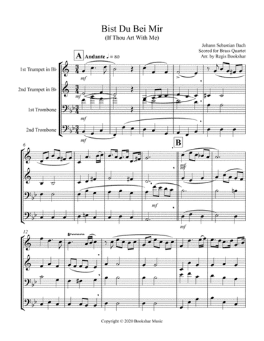 Brass Ensemble - Level 3 - Digital Download SKU: A0.812970 Composed by Johann Sebastian Bach. Arranged by Regis Bookshar. Baroque,Concert,Contemporary,Standards,World. Score and parts. 7 pages. Regis Bookshar #5798393. Published by Regis Bookshar (A0.812970). Brass Quartet - Intermediate - Digital Download. This beautiful melody by Johann Sebastian Bach has been arranged for a Brass Quartet, consisting of 2 Bb Trumpets and 2 Trombones, by Regis Bookshar. Included is a score and a complete set of parts (7 pages). It would be appropriate for high school and college students and could be performed for recitals and church services.  Also, please feel free to search for other arrangements by Regis Bookshar. You may find something else which might interest you as well. I'm certain that students will enjoy playing this arrangement. This product was created by a member of ArrangeMe, Hal Leonard's global self-publishing community of independent composers, arrangers, and songwriters. ArrangeMe allows for the publication of unique arrangements of popular titles and original compositions from a variety of voices and backgrounds. The length, difficulty, and retail pricing are determined solely by the discretion of the person who arranged or composed it. About Digital Downloads Digital Downloads are downloadable sheet music files that can be viewed directly on your computer, tablet or mobile device. Once you download your digital sheet music, you can view and print it at home, school, or anywhere you want to make music, and you don’t have to be connected to the internet. Just purchase, download and play! PLEASE NOTE: Your Digital Download will have a watermark at the bottom of each page that will include your name, purchase date and number of copies purchased. You are only authorized to print the number of copies that you have purchased. You may not digitally distribute or print more copies than purchased for use (i.e., you may not print or digitally distribute individual copies to friends or students).