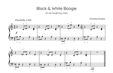 Piano Solo - Level 1 - Digital Download SKU: A0.1018124 Composed by Christine Donkin. 20th Century. Score. 1 pages. Chrisitne Donkin #623708. Published by Chrisitne Donkin (A0.1018124). Black and White Boogie: Royal Conservatory of Music Prep A; Clockwork: early elementary. This product was created by a member of ArrangeMe, Hal Leonard's global self-publishing community of independent composers, arrangers, and songwriters. ArrangeMe allows for the publication of unique arrangements of popular titles and original compositions from a variety of voices and backgrounds. The length, difficulty, and retail pricing are determined solely by the discretion of the person who arranged or composed it. About Digital Downloads Digital Downloads are downloadable sheet music files that can be viewed directly on your computer, tablet or mobile device. Once you download your digital sheet music, you can view and print it at home, school, or anywhere you want to make music, and you don’t have to be connected to the internet. Just purchase, download and play! PLEASE NOTE: Your Digital Download will have a watermark at the bottom of each page that will include your name, purchase date and number of copies purchased. You are only authorized to print the number of copies that you have purchased. You may not digitally distribute or print more copies than purchased for use (i.e., you may not print or digitally distribute individual copies to friends or students).