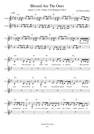Voice Duet Voice - Level 2 - Digital Download SKU: A0.980132 Composed by Christy Miranda Kalfas. Christian,Concert,Praise & Worship,Sacred. 5 pages. Christy Kalfas #5205743. Published by Christy Kalfas (A0.980132). A duet of intermediate difficulty for two vocalists. This version is pitched for two altos, but a version for tenors or sopranos is also available. Blessed are the Ones is the title track on the Album "Blessed are the Ones" - a collaborative project between three churches in England and South Africa. The album was released in 2018 and is available on iTunes. You can hear the song performed here: https://youtu.be/-LPJxOdxCNQ This product was created by a member of ArrangeMe, Hal Leonard’s global self-publishing community of independent composers, arrangers, and songwriters. ArrangeMe allows for the publication of unique arrangements of both popular titles and original compositions from a wide variety of voices and backgrounds. About Digital Downloads Digital Downloads are downloadable sheet music files that can be viewed directly on your computer, tablet or mobile device. Once you download your digital sheet music, you can view and print it at home, school, or anywhere you want to make music, and you don’t have to be connected to the internet. Just purchase, download and play! PLEASE NOTE: Your Digital Download will have a watermark at the bottom of each page that will include your name, purchase date and number of copies purchased. You are only authorized to print the number of copies that you have purchased. You may not digitally distribute or print more copies than purchased for use (i.e., you may not print or digitally distribute individual copies to friends or students).