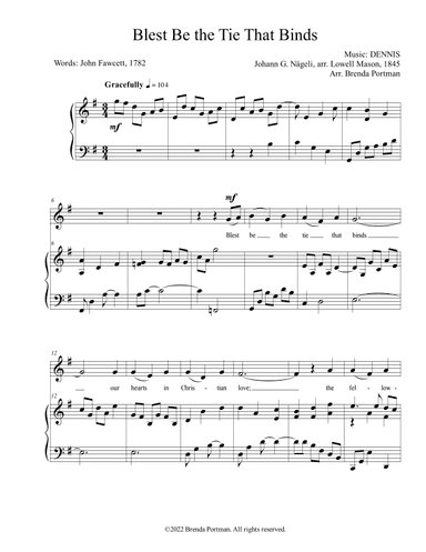Medium-High Voice,Vocal Solo - Level 3 - Digital Download SKU: A0.1109130 Composed by Johann G. Nageli. Arranged by Brenda Portman. Christian,Classical,Religious,Sacred,Traditional. 5 pages. Brenda Portman #711674. Published by Brenda Portman (A0.1109130). A simple and beautiful arrangement of a familiar hymn for solo voice and piano. Perfect as an anthem for worship services. Vocal range D to G. For more vocal pieces by Brenda Portman, visit brendaportman.com. This product was created by a member of ArrangeMe, Hal Leonard’s global self-publishing community of independent composers, arrangers, and songwriters. ArrangeMe allows for the publication of unique arrangements of both popular titles and original compositions from a wide variety of voices and backgrounds. About Digital Downloads Digital Downloads are downloadable sheet music files that can be viewed directly on your computer, tablet or mobile device. Once you download your digital sheet music, you can view and print it at home, school, or anywhere you want to make music, and you don’t have to be connected to the internet. Just purchase, download and play! PLEASE NOTE: Your Digital Download will have a watermark at the bottom of each page that will include your name, purchase date and number of copies purchased. You are only authorized to print the number of copies that you have purchased. You may not digitally distribute or print more copies than purchased for use (i.e., you may not print or digitally distribute individual copies to friends or students).