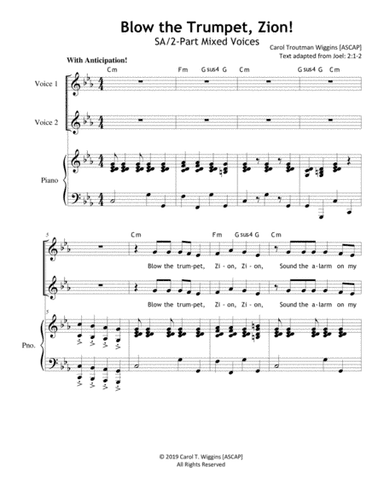 Choral Choir (SA) - Level 3 - Digital Download SKU: A0.727469 Composed by Carol Troutman Wiggins. Christian,Contemporary,Religious,Rock,Sacred. Octavo. 11 pages. Carol Troutman Wiggins #4276227. Published by Carol Troutman Wiggins (A0.727469). BLOW THE TRUMPET, ZION!SA/2-Part Mixed or Equal VoicesWith text adapted from the scripture Joel 2:1-2, this anthem describes the day of the Lord which is drawing near:           Blow the trumpet in Zion; sound the alarm on my holy hill.                                                                                                   Let all who live in the land tremble, for the day of the Lord is coming.                                                                                       It is close at hand-                                                                                                                                                                    A day of darkness and gloom, a day of clouds and blackness.                                                                                                 Like dawn spreading across the mountains a large and mighty army comes,                                                                       Such as never was in ancient times nor ever will be in ages to come.Great for any age school or church choir from middle school age through adult choirAn anthem of strength and anticipationPerfect for LentUpbeat, syncopated rhythmsEasy, repetitive lyricsChords included for additional instrumentsPiano Accompaniment Track on this site. This product was created by a member of ArrangeMe, Hal Leonard’s global self-publishing community of independent composers, arrangers, and songwriters. ArrangeMe allows for the publication of unique arrangements of both popular titles and original compositions from a wide variety of voices and backgrounds. About Digital Downloads Digital Downloads are downloadable sheet music files that can be viewed directly on your computer, tablet or mobile device. Once you download your digital sheet music, you can view and print it at home, school, or anywhere you want to make music, and you don’t have to be connected to the internet. Just purchase, download and play! PLEASE NOTE: Your Digital Download will have a watermark at the bottom of each page that will include your name, purchase date and number of copies purchased. You are only authorized to print the number of copies that you have purchased. You may not digitally distribute or print more copies than purchased for use (i.e., you may not print or digitally distribute individual copies to friends or students).