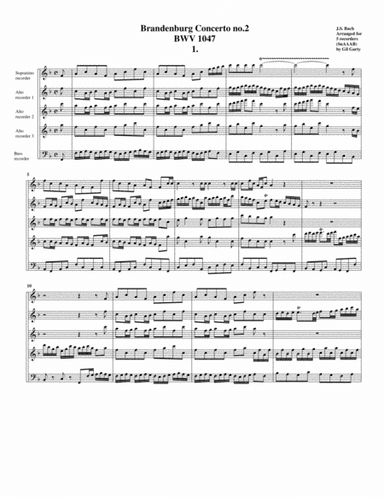 Recorder - Digital Download SKU: A0.756049 Composed by Johann Sebastian Bach. Arranged by Gil Garty. Baroque. Recorder Ensemble. 48 pages. Gil Garty #119393. Published by Gil Garty (A0.756049). Originally for, trumpet, recorder, oboe, violin and string orchestra. Arranged for 5 recorders (SnAAAB). This product was created by a member of ArrangeMe, Hal Leonard’s global self-publishing community of independent composers, arrangers, and songwriters. ArrangeMe allows for the publication of unique arrangements of both popular titles and original compositions from a wide variety of voices and backgrounds. About Digital Downloads Digital Downloads are downloadable sheet music files that can be viewed directly on your computer, tablet or mobile device. Once you download your digital sheet music, you can view and print it at home, school, or anywhere you want to make music, and you don’t have to be connected to the internet. Just purchase, download and play! PLEASE NOTE: Your Digital Download will have a watermark at the bottom of each page that will include your name, purchase date and number of copies purchased. You are only authorized to print the number of copies that you have purchased. You may not digitally distribute or print more copies than purchased for use (i.e., you may not print or digitally distribute individual copies to friends or students).