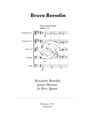Brass Ensemble Horn,Trombone,Trumpet,Tuba - Level 5 - Digital Download SKU: A0.782453 Composed by Alexander Borodin. Arranged by James Haynor. Romantic Period. Score and parts. 30 pages. James Haynor #6636725. Published by James Haynor (A0.782453). Alexander Porfiryevich Borodin was a Russian Romantic composer and chemist. He was one of the prominent 19th-century composers known as "The Five", "Kuchka" or "Mighty Handful", a group dedicated to producing a uniquely Russian kind of classical music. Scored here for brass quintet, Bravo Borodin, is a medley of music from his Polovetsian Dances and In the Steppes of Central Asia. ( Duration 4:50 ) This product was created by a member of ArrangeMe, Hal Leonard’s global self-publishing community of independent composers, arrangers, and songwriters. ArrangeMe allows for the publication of unique arrangements of both popular titles and original compositions from a wide variety of voices and backgrounds. About Digital Downloads Digital Downloads are downloadable sheet music files that can be viewed directly on your computer, tablet or mobile device. Once you download your digital sheet music, you can view and print it at home, school, or anywhere you want to make music, and you don’t have to be connected to the internet. Just purchase, download and play! PLEASE NOTE: Your Digital Download will have a watermark at the bottom of each page that will include your name, purchase date and number of copies purchased. You are only authorized to print the number of copies that you have purchased. You may not digitally distribute or print more copies than purchased for use (i.e., you may not print or digitally distribute individual copies to friends or students).