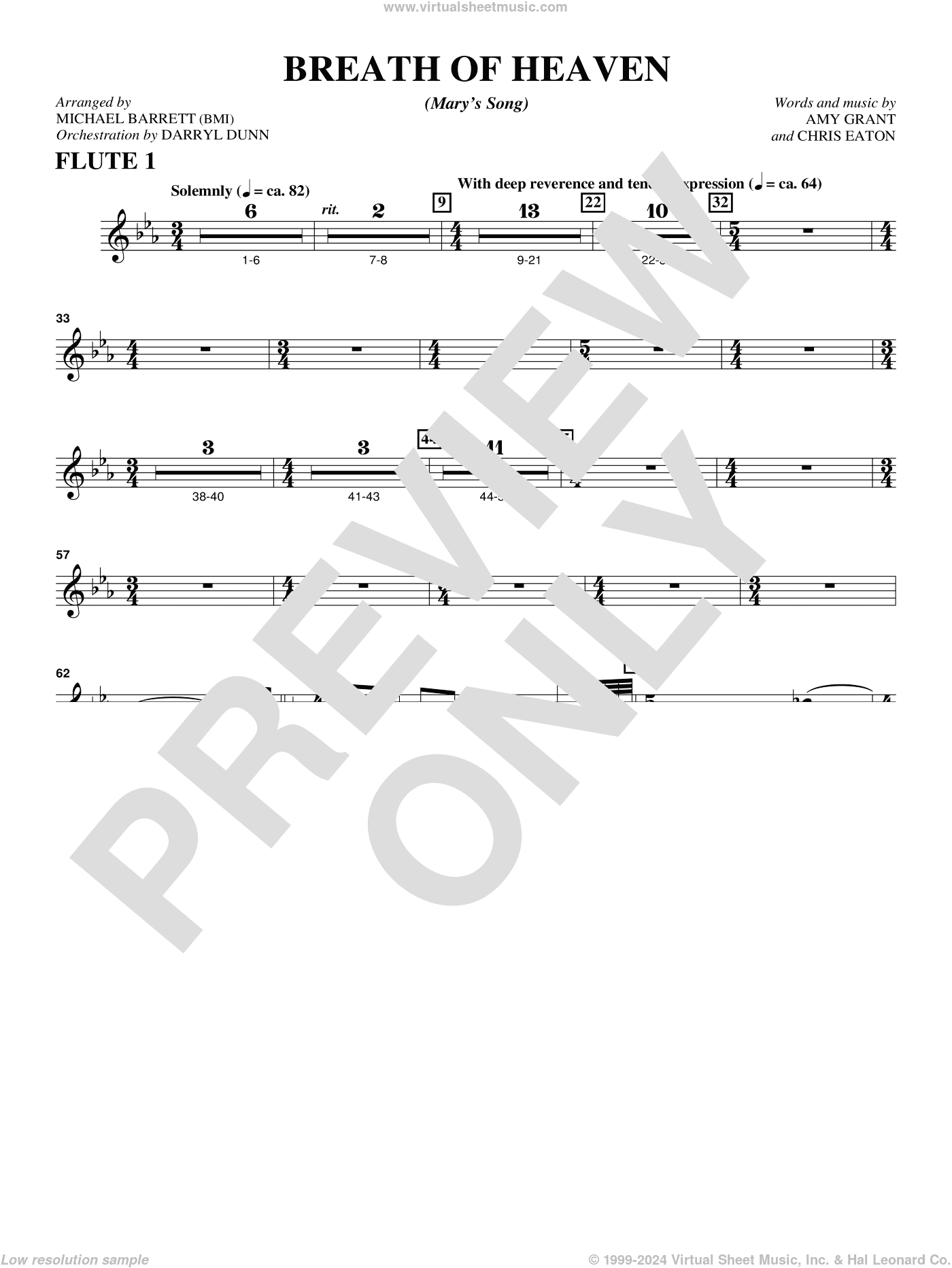 Digital sheet music for orchestra/band (flute 1), from Breath Of Heaven (from All Is Well)|, (from "All Is Well").Publisher: Hal LeonardContributors to this music title:Michael Barrett (arranger, writer)This item includes: PDF (digital sheet music to download and print)Instrumentation:orchestra/band (flute 1)Skill Level:intermediateGenre:christmas, concert, winter, advent, carol, festivalPages:1