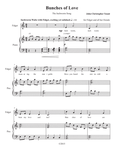 Small Ensemble Flute,Piano,Voice - Level 2 - Digital Download SKU: A0.979433 Composed by John Christopher Yount. Children,Holiday,Instructional,Love. Score and parts. 3 pages. John Christopher Yount #6051715. Published by John Christopher Yount (A0.979433). Bunches of Love is a very simple children's song, sung by Fidget, a character in the Puddle Jumpin' Songbook Collection.  It is the last song in the first book of the series.  Fidget, a nervous rabbit calmed by eating carrots, sings to the inchworm to measure love and innocence in the form of a marigold blossom.  The song is just about one minute in length, with flute and piano accompaniment. This product was created by a member of ArrangeMe, Hal Leonard's global self-publishing community of independent composers, arrangers, and songwriters. ArrangeMe allows for the publication of unique arrangements of popular titles and original compositions from a variety of voices and backgrounds. The length, difficulty, and retail pricing are determined solely by the discretion of the person who arranged or composed it. About Digital Downloads Digital Downloads are downloadable sheet music files that can be viewed directly on your computer, tablet or mobile device. Once you download your digital sheet music, you can view and print it at home, school, or anywhere you want to make music, and you don’t have to be connected to the internet. Just purchase, download and play! PLEASE NOTE: Your Digital Download will have a watermark at the bottom of each page that will include your name, purchase date and number of copies purchased. You are only authorized to print the number of copies that you have purchased. You may not digitally distribute or print more copies than purchased for use (i.e., you may not print or digitally distribute individual copies to friends or students).