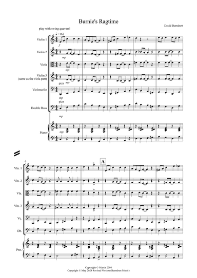 String Orchestra - Level 2 - Digital Download SKU: A0.554939 Composed by David Burndrett. Jazz,Ragtime. 12 pages. David Burndrett #2025479. Published by David Burndrett (A0.554939). This is a fun piece for string orchestra and it is about grade three standard upwards!As usual I have added a violin three part which is the same as the viola part, if you do not have any viola players. I have also added an optional piano part. Download includes the score and all of the parts. This product was created by a member of ArrangeMe, Hal Leonard's global self-publishing community of independent composers, arrangers, and songwriters. ArrangeMe allows for the publication of unique arrangements of popular titles and original compositions from a variety of voices and backgrounds. The length, difficulty, and retail pricing are determined solely by the discretion of the person who arranged or composed it. About Digital Downloads Digital Downloads are downloadable sheet music files that can be viewed directly on your computer, tablet or mobile device. Once you download your digital sheet music, you can view and print it at home, school, or anywhere you want to make music, and you don’t have to be connected to the internet. Just purchase, download and play! PLEASE NOTE: Your Digital Download will have a watermark at the bottom of each page that will include your name, purchase date and number of copies purchased. You are only authorized to print the number of copies that you have purchased. You may not digitally distribute or print more copies than purchased for use (i.e., you may not print or digitally distribute individual copies to friends or students).
