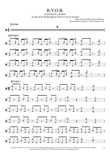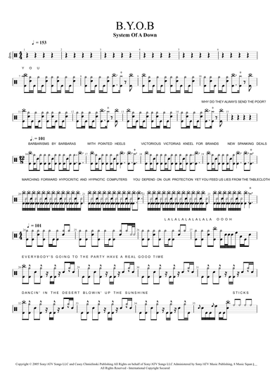 Drums - Level 4 - Digital Download SKU: A0.1161752 By System of a Down. By Daron Malakian and Serj Tankian. Arranged by Cyril Mayer. Rock. Score. 4 pages. Cyril Mayer #762130. Published by Cyril Mayer (A0.1161752). B.Y.O.B - System Of A Down - Drum Transcript + lyrics. This product was created by a member of ArrangeMe, Hal Leonard's global self-publishing community of independent composers, arrangers, and songwriters. ArrangeMe allows for the publication of unique arrangements of popular titles and original compositions from a variety of voices and backgrounds. The length, difficulty, and retail pricing are determined solely by the discretion of the person who arranged or composed it. About Digital Downloads Digital Downloads are downloadable sheet music files that can be viewed directly on your computer, tablet or mobile device. Once you download your digital sheet music, you can view and print it at home, school, or anywhere you want to make music, and you don’t have to be connected to the internet. Just purchase, download and play! PLEASE NOTE: Your Digital Download will have a watermark at the bottom of each page that will include your name, purchase date and number of copies purchased. You are only authorized to print the number of copies that you have purchased. You may not digitally distribute or print more copies than purchased for use (i.e., you may not print or digitally distribute individual copies to friends or students).