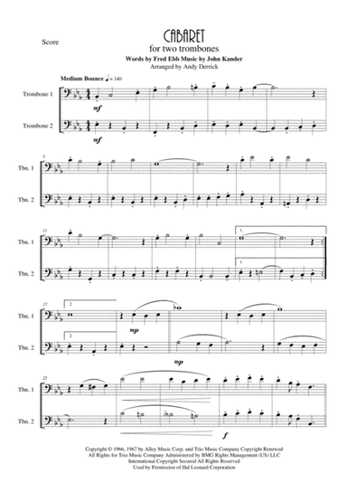 Piano,Vocal,Voice - Level 3 - Digital Download SKU: A0.1230469 By Herb Alpert And The Tijuana Brass. By Fred Ebb and John Kander. Arranged by Dave Gingras and John E. Dosher. Broadway,Jazz,Musical/Show. Score. 2 pages. DAVID LEE GINGRAS #826173. Published by DAVID LEE GINGRAS (A0.1230469). "Cabaret" is the title song of the 1966 musical of the same name, sung by the character Sally Bowles. It was composed by John Kander, with lyrics by Fred Ebb. This version features a root-based chord blocking that John and I have used in a number of our arrangements. We also added some pretty cool left-hand fills for your listening (playing?) pleasure - we hope you like what we've done with this grand old tune! This product was created by a member of ArrangeMe, Hal Leonard’s global self-publishing community of independent composers, arrangers, and songwriters. ArrangeMe allows for the publication of unique arrangements of both popular titles and original compositions from a wide variety of voices and backgrounds. About Digital Downloads Digital Downloads are downloadable sheet music files that can be viewed directly on your computer, tablet or mobile device. Once you download your digital sheet music, you can view and print it at home, school, or anywhere you want to make music, and you don’t have to be connected to the internet. Just purchase, download and play! PLEASE NOTE: Your Digital Download will have a watermark at the bottom of each page that will include your name, purchase date and number of copies purchased. You are only authorized to print the number of copies that you have purchased. You may not digitally distribute or print more copies than purchased for use (i.e., you may not print or digitally distribute individual copies to friends or students).