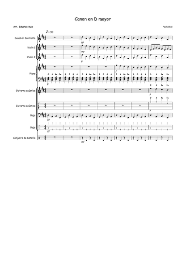 Concert Band - Level 3 - Digital Download SKU: A0.547085 By Johann Pachelbel. By Johann Pachelbel. Arranged by Eduardo Ruiz. Baroque,Classical,Spiritual,Traditional,Wedding. Score and parts. 24 pages. RUGE RUIZ #156995. Published by RUGE RUIZ (A0.547085). In this arrangement, instruments such as sax, drums, guitar and bass were added, respecting the melody and harmony. This product was created by a member of ArrangeMe, Hal Leonard’s global self-publishing community of independent composers, arrangers, and songwriters. ArrangeMe allows for the publication of unique arrangements of both popular titles and original compositions from a wide variety of voices and backgrounds. About Digital Downloads Digital Downloads are downloadable sheet music files that can be viewed directly on your computer, tablet or mobile device. Once you download your digital sheet music, you can view and print it at home, school, or anywhere you want to make music, and you don’t have to be connected to the internet. Just purchase, download and play! PLEASE NOTE: Your Digital Download will have a watermark at the bottom of each page that will include your name, purchase date and number of copies purchased. You are only authorized to print the number of copies that you have purchased. You may not digitally distribute or print more copies than purchased for use (i.e., you may not print or digitally distribute individual copies to friends or students).