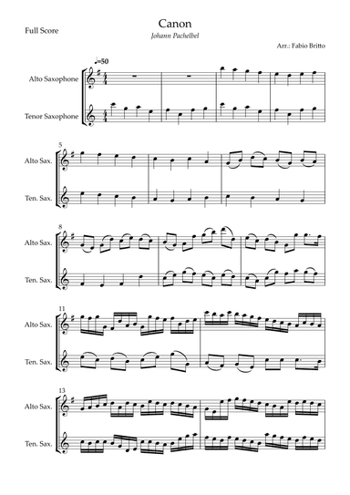 Alto Saxophone,Tenor Saxophone - Level 4 - Digital Download SKU: A0.1145784 Composed by Johann Pachelbel. Arranged by Fabio Britto. Baroque,Classical,Wedding. Saxophone Duet. 5 pages. Fabio Britto #745985. Published by Fabio Britto (A0.1145784). Arrangement of the song Canon - Johann Pachelbel (Wedding/Reduced Version) for Alto Saxophone & Tenor Saxophone Duo. This product was created by a member of ArrangeMe, Hal Leonard’s global self-publishing community of independent composers, arrangers, and songwriters. ArrangeMe allows for the publication of unique arrangements of both popular titles and original compositions from a wide variety of voices and backgrounds. About Digital Downloads Digital Downloads are downloadable sheet music files that can be viewed directly on your computer, tablet or mobile device. Once you download your digital sheet music, you can view and print it at home, school, or anywhere you want to make music, and you don’t have to be connected to the internet. Just purchase, download and play! PLEASE NOTE: Your Digital Download will have a watermark at the bottom of each page that will include your name, purchase date and number of copies purchased. You are only authorized to print the number of copies that you have purchased. You may not digitally distribute or print more copies than purchased for use (i.e., you may not print or digitally distribute individual copies to friends or students).