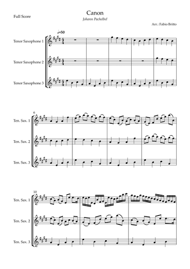 Saxophone Trio,Woodwind Ensemble Alto Saxophone,Soprano Saxophone,Tenor Saxophone - Level 4 - Digital Download SKU: A0.1145376 Composed by Johann Pachelbel. Arranged by Fabio Britto. Baroque,Classical,Wedding. 8 pages. Fabio Britto #745613. Published by Fabio Britto (A0.1145376). Arrangement of the song Canon - Johann Pachelbel (Wedding/Reduced Version) for Saxophone Trio. This product was created by a member of ArrangeMe, Hal Leonard’s global self-publishing community of independent composers, arrangers, and songwriters. ArrangeMe allows for the publication of unique arrangements of both popular titles and original compositions from a wide variety of voices and backgrounds. About Digital Downloads Digital Downloads are downloadable sheet music files that can be viewed directly on your computer, tablet or mobile device. Once you download your digital sheet music, you can view and print it at home, school, or anywhere you want to make music, and you don’t have to be connected to the internet. Just purchase, download and play! PLEASE NOTE: Your Digital Download will have a watermark at the bottom of each page that will include your name, purchase date and number of copies purchased. You are only authorized to print the number of copies that you have purchased. You may not digitally distribute or print more copies than purchased for use (i.e., you may not print or digitally distribute individual copies to friends or students).