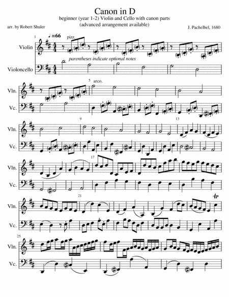 Canon in D for beginner Violin-Cello Duet (with cello canon parts) (arr. Robert Shuler)