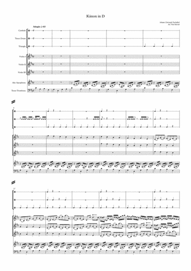 Percussion Ensemble - Level 3 - Digital Download SKU: A0.807171 Composed by Johann Pachelbel. Arranged by Glen Poehlmann. Baroque,Graduation,Standards,Wedding. Score and parts. 14 pages. Arrangements by GPoehlmann #6473761. Published by arrangements by GPoehlmann (A0.807171). CANON IN D - PERCUSSION ENSEMBLEJohann Pachelbel's famous Canon arranged for a Percussion Ensemble. Originally written for a beginning High School ensemble, it could be used with other groups as well.  All of the parts participate in the Canon! All 4 Mallet parts have double stops. Mallet 4 is Bass Clef..  The Percussion Parts are printed on one page (Percussion) and 2 pages (Percussion 1 & Percussion 2) for your convenience.61 measures.   Performance Time approx 2:40.   Medium in Difficulty (Grade 3-).Key: D.   Meter: 4/4.PDF parts included: Score, Mallet 1, Mallet 2, Mallet 3, Mallet 4, Timpani (G - A - D), Percussion (Snare Drum, Bass Drum, Cymbal, Triangle), Percussion 1 (Snare Drum, Bass Drum), Percussion 2 (Cymbal, Triangle). This product was created by a member of ArrangeMe, Hal Leonard’s global self-publishing community of independent composers, arrangers, and songwriters. ArrangeMe allows for the publication of unique arrangements of both popular titles and original compositions from a wide variety of voices and backgrounds. About Digital Downloads Digital Downloads are downloadable sheet music files that can be viewed directly on your computer, tablet or mobile device. Once you download your digital sheet music, you can view and print it at home, school, or anywhere you want to make music, and you don’t have to be connected to the internet. Just purchase, download and play! PLEASE NOTE: Your Digital Download will have a watermark at the bottom of each page that will include your name, purchase date and number of copies purchased. You are only authorized to print the number of copies that you have purchased. You may not digitally distribute or print more copies than purchased for use (i.e., you may not print or digitally distribute individual copies to friends or students).