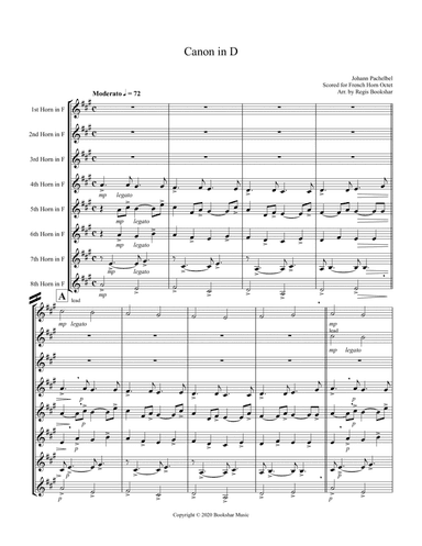 Brass Ensemble Horn - Level 4 - Digital Download SKU: A0.813488 Composed by Johann Pachelbel. Arranged by Regis Bookshar. Baroque,Multicultural,Standards,Wedding,World. Score and parts. 36 pages. Regis Bookshar #6266449. Published by Regis Bookshar (A0.813488). Canon in D (Pachelbel) (D) (French Horn Octet) - Advanced/Intermediate - Digital Download. This selection, Johann Pachelbel's celebrated "Canon in D", is perhaps the most famous canon ever written and has been one of my favorite compositions to arrange. A canon is a polyphonic device in which several voices play the same music, entering in sequence. Pachelbel's "Canon in D", was originally written in the key of D Major and was scored for three violins arranged in canon, accompanied by a basso continuo which repeats the same harmonic progression throughout the entire piece. The common musical term for this is ostinato or ground bass. Regis Bookshar has now arranged this music for a French Horn Octet. Three French Horns play the melody in canon while the ostinato accompaniment is played by the other five instruments. This arrangement is suitable for high school and college students but could also be performed by professional performers. It is perfect for concerts and church services, especially for Weddings, but could be performed for any occasion. Included are a score and a complete set of parts (36 pages). This version is written in the key of D Major, as is the original version, but, if you prefer, another version written in the key of Bb Major, to make it a little easier for some younger performers, is also available. Other versions of Pachelbel's "Canon in D" have also been arranged by Regis Bookshar and are available for a wide variety of instrumental Quintets and Octets, in both the keys of D Major and Bb Major. I think that String players would probably prefer to play the versions in the key of D Major while the Brass and Woodwind musicians might prefer to play the Bb Major versions. I hope you take the time to compare the different versions to find the right version for you. To help you decide which version, or versions, you may want to choose, I have included several musical samples for you to listen to and to hear what these arrangements may sound like and so that you may compare the various arrangements. Also, just to let you know, the Octets written in the key of Bb Major have full-length recordings while the Octets in D Major and all Quintets have only the first 25 measures, or so, available to hear. Please feel free to search for other arrangements by Regis Bookshar which are also available. There are quite a few other arrangements in a variety of styles and I'm certain you will find something else which might interest you as well. Please keep checking because I plan to continue to add new arrangements as often as I can. I'm certain that this exciting arrangement of Pachelbel's "Canon in D" will be a challenge to some performers but will continue to entertain both performers and audiences alike for years to come. This product was created by a member of ArrangeMe, Hal Leonard’s global self-publishing community of independent composers, arrangers, and songwriters. ArrangeMe allows for the publication of unique arrangements of both popular titles and original compositions from a wide variety of voices and backgrounds. About Digital Downloads Digital Downloads are downloadable sheet music files that can be viewed directly on your computer, tablet or mobile device. Once you download your digital sheet music, you can view and print it at home, school, or anywhere you want to make music, and you don’t have to be connected to the internet. Just purchase, download and play! PLEASE NOTE: Your Digital Download will have a watermark at the bottom of each page that will include your name, purchase date and number of copies purchased. You are only authorized to print the number of copies that you have purchased. You may not digitally distribute or print more copies than purchased for use (i.e., you may not print or digitally distribute individual copies to friends or students).