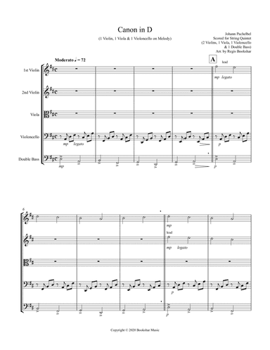 String Ensemble,String Quintet - Level 4 - Digital Download SKU: A0.813467 Composed by Johann Pachelbel. Arranged by Regis Bookshar. Baroque,Concert,Standards,Wedding,World. Score and parts. 27 pages. Regis Bookshar #6264865. Published by Regis Bookshar (A0.813467). Canon in D (Pachelbel) (D) (String Quintet - 2 Violins, 1 Viola, 1 Cello, 1 Bass) - Advanced/Intermediate - Digital Download. This selection, Johann Pachelbel's celebrated "Canon in D", is perhaps the most famous canon ever written and has been one of my favorite compositions to arrange. A canon is a polyphonic device in which several voices play the same music, entering in sequence. Pachelbel's "Canon in D", was originally written in the key of D Major and was scored for three violins arranged in canon, accompanied by a basso continuo which repeats the same harmonic progression throughout the entire piece. The common musical term for this is ostinato or ground bass. Regis Bookshar has now arranged this music for a String Quintet consisting of 2 Violins, 1 Viola, 1 Violoncello and 1 Double Bass. The two Violins and Viola play the melody in canon while the ostinato accompaniment is played by the Violoncello and the Double Bass. This arrangement is suitable for high school and college students but could also be performed by professional performers. It is perfect for concerts and church services, especially for Weddings, but could be performed for any occasion. Included are a score and a complete set of parts (27 pages). This version is written in the key of D Major, but, if you prefer, another version, written in the key of Bb Major, is also available. Other versions of Pachelbel's "Canon in D" have also been arranged by Regis Bookshar and are available for a wide variety of instrumental Quintets and Octets, in both the keys of D Major and Bb Major. I think that String players would probably prefer to play the versions in the key of D Major while the Brass and Woodwind musicians might prefer to play the Bb Major versions. I hope you take the time to compare the different versions to find the right version for you. To help you decide which version, or versions, you may want to choose, I have included several musical samples for you to listen to and to hear what these arrangements may sound like and so that you may compare the various arrangements. Also, just to let you know, the Octets written in the key of Bb Major have full-length recordings while the Octets in D Major and all Quintets have only the first 25 measures, or so, available to hear. Please feel free to search for other arrangements by Regis Bookshar which are also available. There are quite a few other arrangements in a variety of styles and I'm certain you will find something else which might interest you as well. Please keep checking because I plan to continue to add new arrangements as often as I can. I'm certain that this exciting arrangement of Pachelbel's "Canon in D" will be a challenge to some performers but will continue to entertain both performers and audiences alike for years to come. This product was created by a member of ArrangeMe, Hal Leonard's global self-publishing community of independent composers, arrangers, and songwriters. ArrangeMe allows for the publication of unique arrangements of popular titles and original compositions from a variety of voices and backgrounds. The length, difficulty, and retail pricing are determined solely by the discretion of the person who arranged or composed it. About Digital Downloads Digital Downloads are downloadable sheet music files that can be viewed directly on your computer, tablet or mobile device. Once you download your digital sheet music, you can view and print it at home, school, or anywhere you want to make music, and you don’t have to be connected to the internet. Just purchase, download and play! PLEASE NOTE: Your Digital Download will have a watermark at the bottom of each page that will include your name, purchase date and number of copies purchased. You are only authorized to print the number of copies that you have purchased. You may not digitally distribute or print more copies than purchased for use (i.e., you may not print or digitally distribute individual copies to friends or students).