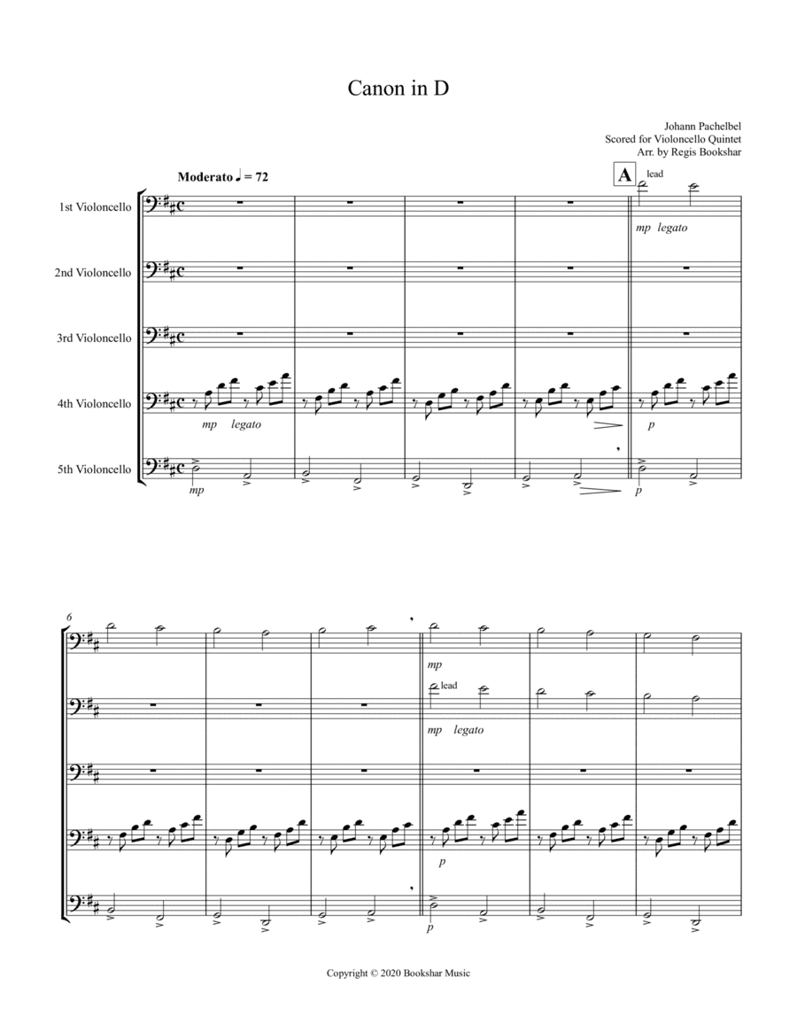 Canon in D (Pachelbel) (D) (Violoncello Quintet) (arr. Regis Bookshar)