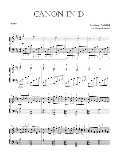 Piano Solo - Level 4 - Digital Download SKU: A0.1225411 Composed by Johann Pachelbel. Arranged by B. C. Dockery. Baroque,Classical,Wedding. Score. 3 pages. Ben Dockery #821477. Published by Ben Dockery (A0.1225411). Johann Pachelbel's most famous composition; this canon is arranged for solo piano. Great for weddings, recitals, graduation ceremonies, parties, and celebrations of all kinds. This product was created by a member of ArrangeMe, Hal Leonard’s global self-publishing community of independent composers, arrangers, and songwriters. ArrangeMe allows for the publication of unique arrangements of both popular titles and original compositions from a wide variety of voices and backgrounds. About Digital Downloads Digital Downloads are downloadable sheet music files that can be viewed directly on your computer, tablet or mobile device. Once you download your digital sheet music, you can view and print it at home, school, or anywhere you want to make music, and you don’t have to be connected to the internet. Just purchase, download and play! PLEASE NOTE: Your Digital Download will have a watermark at the bottom of each page that will include your name, purchase date and number of copies purchased. You are only authorized to print the number of copies that you have purchased. You may not digitally distribute or print more copies than purchased for use (i.e., you may not print or digitally distribute individual copies to friends or students).