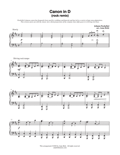 Piano Solo - Level 2 - Digital Download SKU: A0.741237 Composed by Johann Pachelbel. Arranged by Anne Britt. Baroque,Concert,Pop,Rock. Score. 4 pages. Anne Britt #6070573. Published by Anne Britt (A0.741237). Pachelbel’s famous Canon was popular during his lifetime, but then slipped into obscurity for centuries before making a comeback in the 1970s and '80s. Since then it has frequently been used for weddings and funerals and has led to a variety of pop song adaptations. This early intermediate piano solo remix starts out with the classic slow chord progression of the original, then shifts gears to a driving rock beat that would certainly liven up a funeral. 4 pages. Performance time: approximately 2:10.Included in the "Piano Remixes: Classics Vol. 1" early intermediate songbook: https://www.sheetmusicplus.com/title/22083334Visit the publisher's website for contact info and some free sheet music downloads: https://annebrittmusic.com/ This product was created by a member of ArrangeMe, Hal Leonard's global self-publishing community of independent composers, arrangers, and songwriters. ArrangeMe allows for the publication of unique arrangements of popular titles and original compositions from a variety of voices and backgrounds. The length, difficulty, and retail pricing are determined solely by the discretion of the person who arranged or composed it. About Digital Downloads Digital Downloads are downloadable sheet music files that can be viewed directly on your computer, tablet or mobile device. Once you download your digital sheet music, you can view and print it at home, school, or anywhere you want to make music, and you don’t have to be connected to the internet. Just purchase, download and play! PLEASE NOTE: Your Digital Download will have a watermark at the bottom of each page that will include your name, purchase date and number of copies purchased. You are only authorized to print the number of copies that you have purchased. You may not digitally distribute or print more copies than purchased for use (i.e., you may not print or digitally distribute individual copies to friends or students).