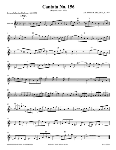 Small Ensemble Flute,Guitar,Violin - Level 3 - Digital Download SKU: A0.784844 Composed by Johann Sebastian Bach. Arranged by McCorkle, Dennis F. Baroque,Instructional,Standards. Score and parts. 29 pages. DF McCorkle Music and eBook Publications #11809. Published by DF McCorkle Music and eBook Publications (A0.784844). CANTATA 156 "Ich Steh Mit Einem Fuss Im Grabe" in F Major, Sinfonia, BWV 156 by Johann Sebastian Bach. Transcribed and arranged for Two Guitars by Dennis McCorkle. Also suitable for Solo C Instruments such as Flute or Violin with Classical Guitar accompaniment. Includes all parts in Standard Notation and Tablature. This is one of Bach’s most beautiful melodies. Difficulty Level: Intermediate. Also included with your order is our new 20 page catalog of over 150 titles at no additional charge. This product was created by a member of ArrangeMe, Hal Leonard's global self-publishing community of independent composers, arrangers, and songwriters. ArrangeMe allows for the publication of unique arrangements of popular titles and original compositions from a variety of voices and backgrounds. The length, difficulty, and retail pricing are determined solely by the discretion of the person who arranged or composed it. About Digital Downloads Digital Downloads are downloadable sheet music files that can be viewed directly on your computer, tablet or mobile device. Once you download your digital sheet music, you can view and print it at home, school, or anywhere you want to make music, and you don’t have to be connected to the internet. Just purchase, download and play! PLEASE NOTE: Your Digital Download will have a watermark at the bottom of each page that will include your name, purchase date and number of copies purchased. You are only authorized to print the number of copies that you have purchased. You may not digitally distribute or print more copies than purchased for use (i.e., you may not print or digitally distribute individual copies to friends or students).
