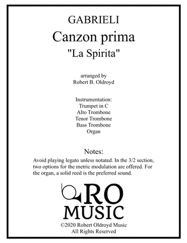 Small Ensemble Organ - Level 4 - Digital Download SKU: A0.941792 Composed by Gabrieli. Arranged by Robert B. Oldroyd. Concert,Graduation,Renaissance,Sacred,Wedding. Score and parts. 15 pages. Robert Oldroyd Music #5290115. Published by Robert Oldroyd Music (A0.941792). This arrangement is set for Trumpet, Alto Trombone, Tenor Trombone, Bass Trombone and Organ. A substitute C Trumpet part for the alto trombone is included. This can be used for recitals, ceremonies and church services. This product was created by a member of ArrangeMe, Hal Leonard's global self-publishing community of independent composers, arrangers, and songwriters. ArrangeMe allows for the publication of unique arrangements of popular titles and original compositions from a variety of voices and backgrounds. The length, difficulty, and retail pricing are determined solely by the discretion of the person who arranged or composed it. About Digital Downloads Digital Downloads are downloadable sheet music files that can be viewed directly on your computer, tablet or mobile device. Once you download your digital sheet music, you can view and print it at home, school, or anywhere you want to make music, and you don’t have to be connected to the internet. Just purchase, download and play! PLEASE NOTE: Your Digital Download will have a watermark at the bottom of each page that will include your name, purchase date and number of copies purchased. You are only authorized to print the number of copies that you have purchased. You may not digitally distribute or print more copies than purchased for use (i.e., you may not print or digitally distribute individual copies to friends or students).