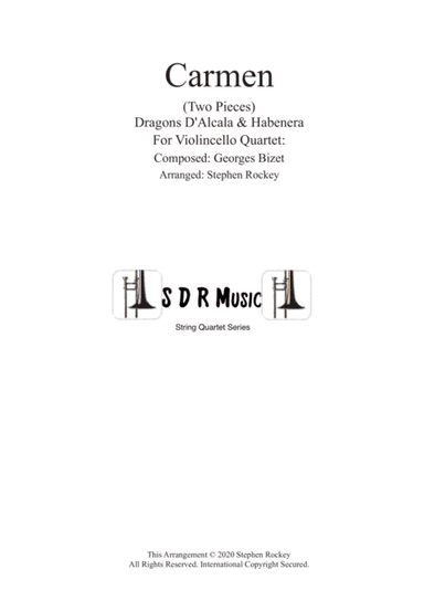 String Quartet Cello,String Quartet - Level 4 - Digital Download SKU: A0.761159 Composed by Georges Bizet. Arranged by Stephen Rockey. Concert,Graduation,Opera,Romantic Period,World. Score and parts. 23 pages. Stephen Rockey #5321971. Published by Stephen Rockey (A0.761159). Two pieces from Carmen: Dragons D'Alcala and Habanera arranged for Violincello Quartet. Suitable for concerts, recitals etc., not too easy, but hopefully lots of fun to play. Enjoy! This product was created by a member of ArrangeMe, Hal Leonard’s global self-publishing community of independent composers, arrangers, and songwriters. ArrangeMe allows for the publication of unique arrangements of both popular titles and original compositions from a wide variety of voices and backgrounds. About Digital Downloads Digital Downloads are downloadable sheet music files that can be viewed directly on your computer, tablet or mobile device. Once you download your digital sheet music, you can view and print it at home, school, or anywhere you want to make music, and you don’t have to be connected to the internet. Just purchase, download and play! PLEASE NOTE: Your Digital Download will have a watermark at the bottom of each page that will include your name, purchase date and number of copies purchased. You are only authorized to print the number of copies that you have purchased. You may not digitally distribute or print more copies than purchased for use (i.e., you may not print or digitally distribute individual copies to friends or students).