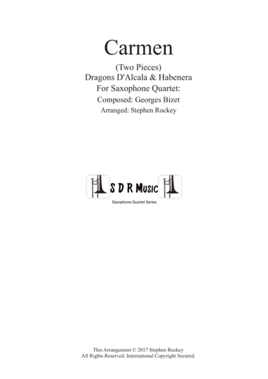 Woodwind Ensemble Alto Saxophone,Baritone Saxophone,Soprano Saxophone,Tenor Saxophone - Level 3 - Digital Download SKU: A0.760996 Composed by Georges Bizet. Arranged by Arranged by Stephen Rockey. Concert,Graduation,Romantic Period,Wedding. 17 pages. Stephen Rockey #3590087. Published by Stephen Rockey (A0.760996). Two Pieces from Carmen by Georges Bizet, arranged for Saxophone Quartet; Soprano, Alto, Tenor and Baritone Saxophones. Dragons D'Alcala and Habanera, making a good addition to any repertoire, suitable for many occasions, concerts, garden parties, recitals etc. This product was created by a member of ArrangeMe, Hal Leonard's global self-publishing community of independent composers, arrangers, and songwriters. ArrangeMe allows for the publication of unique arrangements of popular titles and original compositions from a variety of voices and backgrounds. The length, difficulty, and retail pricing are determined solely by the discretion of the person who arranged or composed it. About Digital Downloads Digital Downloads are downloadable sheet music files that can be viewed directly on your computer, tablet or mobile device. Once you download your digital sheet music, you can view and print it at home, school, or anywhere you want to make music, and you don’t have to be connected to the internet. Just purchase, download and play! PLEASE NOTE: Your Digital Download will have a watermark at the bottom of each page that will include your name, purchase date and number of copies purchased. You are only authorized to print the number of copies that you have purchased. You may not digitally distribute or print more copies than purchased for use (i.e., you may not print or digitally distribute individual copies to friends or students).