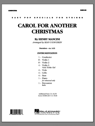 String Orchestra (Score & Parts) - Grade 2 SKU: HL.4491119 Composed by Henry Mancini. Arranged by Sean O'Loughlin. Easy Pop Specials For Strings. Christmas. Published by Hal Leonard (HL.4491119). UPC: 884088613259. 9.0x12.0x0.217 inches.Henry Mancini's lovely carol is yet another memorable melody from his rich library of film music. The song was featured in a 1964 film of the same name, a re-telling of Dickens' A Christmas Carol. This simple, elegant song is sure to please audiences and your players with this well-crafted arrangement for string ensemble.