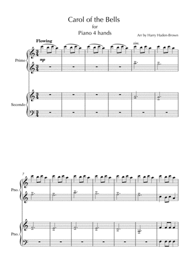 Instrumental Duet,Piano - Digital Download SKU: A0.720979 Composed by Leontovich, Mykola Dmytrovich. Arranged by Anne L Christopherson GRSM ARCM. 20th Century,Christmas,Holiday. 5 pages. Music-Scores.com #3866195. Published by Music-Scores.com (A0.720979). Carol of the Bells, or the Ukrainian Bell Carol, is an old New Year Carol and was performed using hand bells. It is said to be based on the traditional Ukrainian folk chant, Shchedryk.This arrangement is for Piano Duet.Arranged by Anne Christopherson at https://www.music-scores.com This product was created by a member of ArrangeMe, Hal Leonard's global self-publishing community of independent composers, arrangers, and songwriters. ArrangeMe allows for the publication of unique arrangements of popular titles and original compositions from a variety of voices and backgrounds. The length, difficulty, and retail pricing are determined solely by the discretion of the person who arranged or composed it. About Digital Downloads Digital Downloads are downloadable sheet music files that can be viewed directly on your computer, tablet or mobile device. Once you download your digital sheet music, you can view and print it at home, school, or anywhere you want to make music, and you don’t have to be connected to the internet. Just purchase, download and play! PLEASE NOTE: Your Digital Download will have a watermark at the bottom of each page that will include your name, purchase date and number of copies purchased. You are only authorized to print the number of copies that you have purchased. You may not digitally distribute or print more copies than purchased for use (i.e., you may not print or digitally distribute individual copies to friends or students).