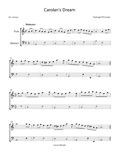 Bassoon,Flute,Instrumental Duet - Level 2 - Digital Download SKU: A0.1213735 By Turlough O'carolan. By Turlough O'carolan. Arranged by Arezzo Music. Celtic,Irish. 3 pages. Arezzo Music #810932. Published by Arezzo Music (A0.1213735). Carolan’s Dream Flute and Bassoon Sheet Music Join us on a musical journey through the magical world of Celtic music with our rendition of Carolan's Dream arranged for flute Sheet music and bassoon. This beautiful melody was originally composed by the Irish harper Turlough O'Carolan in the 17th century and has since become a beloved classic of the Celtic tradition. Our arrangement features the lovely interplay between the rich, deep tones of the bassoon and the sweet, soaring melodies of the flute. Together, they weave a tapestry of sound that transports the listener to a land of rolling hills, misty moors, and ancient legends. As you listen The Flute sheet Music you'll hear the intricate interplay of the harmony whit the Bassoon sheet music line , each one complementing the other in a delicate dance of harmony and counterpoint. You'll also hear the subtle nuances of the melody, with its intricate ornamentation and variations, all expertly crafted to showcase the beauty and complexity of Celtic music.Whether you're a longtime fan of Celtic music or simply looking for a new musical adventure, our arrangement of this timeless classic for Flute sheet music and Bassoon is sure to delight and inspire. Hope that you like our Carolan’s Dream Flute and Bassoon Sheet Music. This product was created by a member of ArrangeMe, Hal Leonard’s global self-publishing community of independent composers, arrangers, and songwriters. ArrangeMe allows for the publication of unique arrangements of both popular titles and original compositions from a wide variety of voices and backgrounds. About Digital Downloads Digital Downloads are downloadable sheet music files that can be viewed directly on your computer, tablet or mobile device. Once you download your digital sheet music, you can view and print it at home, school, or anywhere you want to make music, and you don’t have to be connected to the internet. Just purchase, download and play! PLEASE NOTE: Your Digital Download will have a watermark at the bottom of each page that will include your name, purchase date and number of copies purchased. You are only authorized to print the number of copies that you have purchased. You may not digitally distribute or print more copies than purchased for use (i.e., you may not print or digitally distribute individual copies to friends or students).