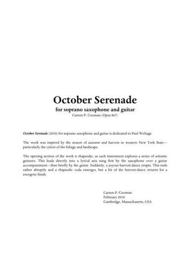 Instrumental Duet Guitar,Instrumental Duet,Saxophone - Level 4 - Digital Download SKU: A0.775993 Composed by Carson Cooman. Contemporary. Score and parts. 8 pages. Musik Fabrik Music Publishing #2035291. Published by Musik Fabrik Music Publishing (A0.775993). October Serenade (2010) for soprano saxophone and guitar is dedicated to Paul Wehage. The work was inspired by the season of autumn and harvest in western New York State- particularly the colors of the foliage and landscape. The opening section of the work is rhapsodic, as each instrument explores a series of soloistic gestures. This leads directly into a lyrical aria sung first by the saxophone over a guitar accompaniment-then briefly by the guitar. Suddenly, a joyous harvest-dance erupts. This ends rather abruptly and a rhapsodic coda emerges, but a bit of the harvest-dance returns for a energetic finish. Carson. This product was created by a member of ArrangeMe, Hal Leonard’s global self-publishing community of independent composers, arrangers, and songwriters. ArrangeMe allows for the publication of unique arrangements of both popular titles and original compositions from a wide variety of voices and backgrounds. About Digital Downloads Digital Downloads are downloadable sheet music files that can be viewed directly on your computer, tablet or mobile device. Once you download your digital sheet music, you can view and print it at home, school, or anywhere you want to make music, and you don’t have to be connected to the internet. Just purchase, download and play! PLEASE NOTE: Your Digital Download will have a watermark at the bottom of each page that will include your name, purchase date and number of copies purchased. You are only authorized to print the number of copies that you have purchased. You may not digitally distribute or print more copies than purchased for use (i.e., you may not print or digitally distribute individual copies to friends or students).