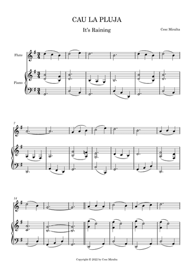 Flute,Piano - Level 2 - Digital Download SKU: A0.1130370 By Cesc Miralta. By Cesc Miralta. Arranged by Cesc Miralta. Children,Classical. Score and part. 4 pages. Cesc Miralta #730738. Published by Cesc Miralta (A0.1130370). Composition for beginner children. FLUTE and PIANO. Flute playing range G3 to E4 G Major. This product was created by a member of ArrangeMe, Hal Leonard's global self-publishing community of independent composers, arrangers, and songwriters. ArrangeMe allows for the publication of unique arrangements of popular titles and original compositions from a variety of voices and backgrounds. The length, difficulty, and retail pricing are determined solely by the discretion of the person who arranged or composed it. About Digital Downloads Digital Downloads are downloadable sheet music files that can be viewed directly on your computer, tablet or mobile device. Once you download your digital sheet music, you can view and print it at home, school, or anywhere you want to make music, and you don’t have to be connected to the internet. Just purchase, download and play! PLEASE NOTE: Your Digital Download will have a watermark at the bottom of each page that will include your name, purchase date and number of copies purchased. You are only authorized to print the number of copies that you have purchased. You may not digitally distribute or print more copies than purchased for use (i.e., you may not print or digitally distribute individual copies to friends or students).
