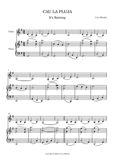 Piano,Violin - Level 1 - Digital Download SKU: A0.1117304 By Cesc Miralta. By Cesc Miralta. Arranged by Cesc Miralta. Children,Classical. 4 pages. Cesc Miralta #718886. Published by Cesc Miralta (A0.1117304). Composition for beginner children. Violin and Piano. Violin playing range G2 to E3. This product was created by a member of ArrangeMe, Hal Leonard's global self-publishing community of independent composers, arrangers, and songwriters. ArrangeMe allows for the publication of unique arrangements of popular titles and original compositions from a variety of voices and backgrounds. The length, difficulty, and retail pricing are determined solely by the discretion of the person who arranged or composed it. About Digital Downloads Digital Downloads are downloadable sheet music files that can be viewed directly on your computer, tablet or mobile device. Once you download your digital sheet music, you can view and print it at home, school, or anywhere you want to make music, and you don’t have to be connected to the internet. Just purchase, download and play! PLEASE NOTE: Your Digital Download will have a watermark at the bottom of each page that will include your name, purchase date and number of copies purchased. You are only authorized to print the number of copies that you have purchased. You may not digitally distribute or print more copies than purchased for use (i.e., you may not print or digitally distribute individual copies to friends or students).