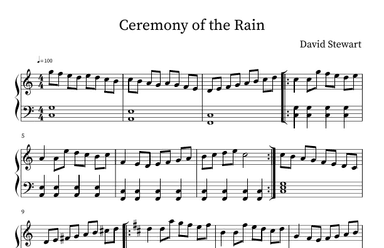 Piano Solo - Level 2 - Digital Download SKU: A0.1137669 Composed by David Stewart. Classical,Traditional. Score. 1 pages. David Stewart #737920. Published by David Stewart (A0.1137669). Ceremony of the Rain by David Stewart Easy piece for beginner piano students. This product was created by a member of ArrangeMe, Hal Leonard’s global self-publishing community of independent composers, arrangers, and songwriters. ArrangeMe allows for the publication of unique arrangements of both popular titles and original compositions from a wide variety of voices and backgrounds. About Digital Downloads Digital Downloads are downloadable sheet music files that can be viewed directly on your computer, tablet or mobile device. Once you download your digital sheet music, you can view and print it at home, school, or anywhere you want to make music, and you don’t have to be connected to the internet. Just purchase, download and play! PLEASE NOTE: Your Digital Download will have a watermark at the bottom of each page that will include your name, purchase date and number of copies purchased. You are only authorized to print the number of copies that you have purchased. You may not digitally distribute or print more copies than purchased for use (i.e., you may not print or digitally distribute individual copies to friends or students).