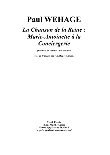 Flute,Piano,Voice - Level 3 - Digital Download SKU: A0.1278544 Composed by Paul Wehage. 21st Century,Chamber,Classical,Historic. 12 pages. Musik Fabrik Music Publishing #870225. Published by Musik Fabrik Music Publishing (A0.1278544). A setting of a text by the French poet P.A. Dupré-Laverré. Marie-Antoinette sings the night before her execution in her cell at the Consiergerie.Si vous voulez ma mort, ne cherchez pas d'excuseLa voix du peuple est là ainsi qu’une arme blancheCe n’est que vous ici et non moi qu’on abuse,Et par ce goût du sang que l’on veut que j’étanche.Que vous ai-je donc fait si ce n'est existerEn ce monde où plus rien ne justifie qu'on reste,Quand la mort réjouit ceux qui voient affûterCette lame qui glisse sur le cou, là ! si preste.Elle glissera sur moi comme elle glissa sur Louis,Au mitan de l'hiver. Moi, j’attendrai l'automne :Le feuillage rougi des arbres aux TuileriesSe teintera alors du sang que je vous donne.P.A. Dupré-Laverré in "Une Reine à part". This product was created by a member of ArrangeMe, Hal Leonard’s global self-publishing community of independent composers, arrangers, and songwriters. ArrangeMe allows for the publication of unique arrangements of both popular titles and original compositions from a wide variety of voices and backgrounds. About Digital Downloads Digital Downloads are downloadable sheet music files that can be viewed directly on your computer, tablet or mobile device. Once you download your digital sheet music, you can view and print it at home, school, or anywhere you want to make music, and you don’t have to be connected to the internet. Just purchase, download and play! PLEASE NOTE: Your Digital Download will have a watermark at the bottom of each page that will include your name, purchase date and number of copies purchased. You are only authorized to print the number of copies that you have purchased. You may not digitally distribute or print more copies than purchased for use (i.e., you may not print or digitally distribute individual copies to friends or students).