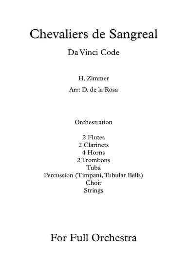 Instrumental Duet,Piano Cello,Instrumental Duet,Piano,Violin - Level 5 - Digital Download SKU: A0.1177832 Composed by Hans Zimmer. Arranged by Felipe Queiroga. Chamber,Film/TV,Video Game,Wedding. 16 pages. Golden Skull Editions #777796. Published by Golden Skull Editions (A0.1177832). "Chevaliers de Sangreal," written by Hans Zimmer for the 2006 film The Da Vinci Code, is a haunting and powerful composition. This arrangement for violin, cello, and piano brings a new dimension to the piece, showcasing the intimacy and depth of these instruments. The sweeping strings and driving rhythm are translated beautifully in this trio format, capturing the sense of mystery and adventure central to the film's story. The combination of these instruments creates a rich and dynamic soundscape that is sure to captivate and transport audiences. Whether you are a fan of Hans Zimmer or a lover of classical music, this arrangement of "Chevaliers de Sangreal" is not to be missed. This product was created by a member of ArrangeMe, Hal Leonard's global self-publishing community of independent composers, arrangers, and songwriters. ArrangeMe allows for the publication of unique arrangements of popular titles and original compositions from a variety of voices and backgrounds. The length, difficulty, and retail pricing are determined solely by the discretion of the person who arranged or composed it. About Digital Downloads Digital Downloads are downloadable sheet music files that can be viewed directly on your computer, tablet or mobile device. Once you download your digital sheet music, you can view and print it at home, school, or anywhere you want to make music, and you don’t have to be connected to the internet. Just purchase, download and play! PLEASE NOTE: Your Digital Download will have a watermark at the bottom of each page that will include your name, purchase date and number of copies purchased. You are only authorized to print the number of copies that you have purchased. You may not digitally distribute or print more copies than purchased for use (i.e., you may not print or digitally distribute individual copies to friends or students).