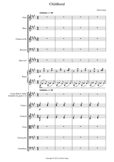 Chamber Orchestra - Level 1 - Digital Download SKU: A0.731236 Composed by Edwin Sung. Classical,Film/TV,Instructional,Standards. Score and parts. 11 pages. Edwin Sung #15367. Published by Edwin Sung (A0.731236). "Childhood" is a short piece for violin solo (suitable for beginners) and orchestra written by Edwin Sung. This piece was written right after some flashbacks of his happy childhood memories, including his first violin lesson when he was 6. Meanwhile, he decided to make the solo tune playable by beginner violinists as a reward for their efforts on learning to play violin. Moreover, the orchestration of this piece should encourage more keen people to appreciate and learn classical instruments and music. Date published: 24th January, 2015 Enjoy! This product was created by a member of ArrangeMe, Hal Leonard’s global self-publishing community of independent composers, arrangers, and songwriters. ArrangeMe allows for the publication of unique arrangements of both popular titles and original compositions from a wide variety of voices and backgrounds. About Digital Downloads Digital Downloads are downloadable sheet music files that can be viewed directly on your computer, tablet or mobile device. Once you download your digital sheet music, you can view and print it at home, school, or anywhere you want to make music, and you don’t have to be connected to the internet. Just purchase, download and play! PLEASE NOTE: Your Digital Download will have a watermark at the bottom of each page that will include your name, purchase date and number of copies purchased. You are only authorized to print the number of copies that you have purchased. You may not digitally distribute or print more copies than purchased for use (i.e., you may not print or digitally distribute individual copies to friends or students).