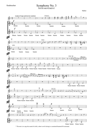 Choral Choir (Unison) - Level 3 - Digital Download SKU: A0.759593 Composed by Gustav Mahler. Arranged by Mark Lansom. 20th Century,Children,Romantic Period,Standards. Octavo. 2 pages. Mark Lansom #6266777. Published by Mark Lansom (A0.759593). A useful and new edition of the Children's Chorus, the fifth movement of Mahler's Third Symphony. There are cues throughout from the orchestra, soloist and other choruses, and the edition fits onto two sides of a single piece of paper, making it straightforward and economical to present to a large choir. The audio clip is an exact representation of what is on the page including its bars rest. This edition has been double checked and used successfully in rehearsal and performance. This product was created by a member of ArrangeMe, Hal Leonard's global self-publishing community of independent composers, arrangers, and songwriters. ArrangeMe allows for the publication of unique arrangements of popular titles and original compositions from a variety of voices and backgrounds. The length, difficulty, and retail pricing are determined solely by the discretion of the person who arranged or composed it. About Digital Downloads Digital Downloads are downloadable sheet music files that can be viewed directly on your computer, tablet or mobile device. Once you download your digital sheet music, you can view and print it at home, school, or anywhere you want to make music, and you don’t have to be connected to the internet. Just purchase, download and play! PLEASE NOTE: Your Digital Download will have a watermark at the bottom of each page that will include your name, purchase date and number of copies purchased. You are only authorized to print the number of copies that you have purchased. You may not digitally distribute or print more copies than purchased for use (i.e., you may not print or digitally distribute individual copies to friends or students).