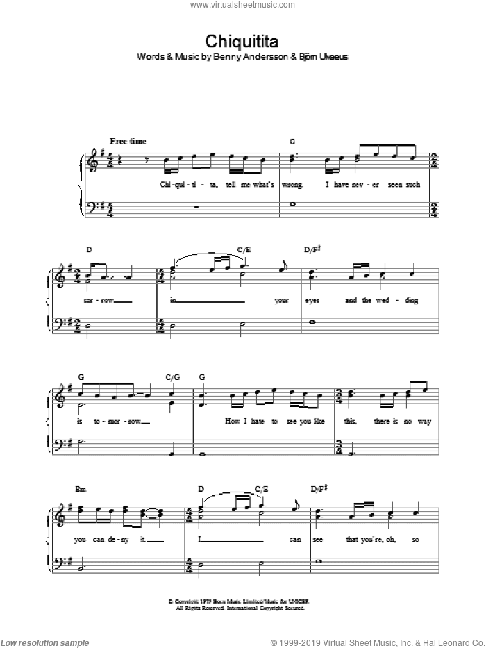 Digital sheet music for pianoNOTE: chords indications, lyrics may be included (please, check the first page above before to buy this item to see what's included)Publisher: Hal LeonardContributors to this music title:Benny Andersson (writer)Bjorn Ulvaeus (writer)This item includes: PDF (digital sheet music to download and print)Instrumentation:piano soloSkill Level:easyGenre:pop, childrenPages:4