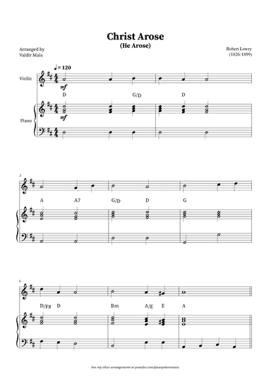 Piano,Violin - Level 1 - Digital Download SKU: A0.1196315 Composed by Robert Lowry. Arranged by Valdir Maia. Christian,Easter,Praise & Worship,Religious,Spiritual. 3 pages. Valdir Maia #795469. Published by Valdir Maia (A0.1196315). Christ Arose (He Arose) for violin and piano with chords..If you're looking for easy sheet music for the Easter hymn "Christ Arose" (also known as "He Arose"), look no further! Our collection of violin and piano arrangements makes it easy to bring this timeless classic to life in your Easter service..Our sheet music arrangements are designed to make it easy for even beginner-level musicians to play and sing this hymn. With simplified piano accompaniments and clear, you'll be able to lead your congregation in a beautiful and moving rendition of "Christ Arose.".Wanna see more of my arrangements? Check out my page here and on youtube.com/@easysheetmusic. This product was created by a member of ArrangeMe, Hal Leonard’s global self-publishing community of independent composers, arrangers, and songwriters. ArrangeMe allows for the publication of unique arrangements of both popular titles and original compositions from a wide variety of voices and backgrounds. About Digital Downloads Digital Downloads are downloadable sheet music files that can be viewed directly on your computer, tablet or mobile device. Once you download your digital sheet music, you can view and print it at home, school, or anywhere you want to make music, and you don’t have to be connected to the internet. Just purchase, download and play! PLEASE NOTE: Your Digital Download will have a watermark at the bottom of each page that will include your name, purchase date and number of copies purchased. You are only authorized to print the number of copies that you have purchased. You may not digitally distribute or print more copies than purchased for use (i.e., you may not print or digitally distribute individual copies to friends or students).