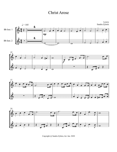 Clarinet,Piano - Level 3 - Digital Download SKU: A0.524686 Composed by Charles Wesley, Lyra Davidica. Arranged by John A. Dempsey. Christian,Easter,Praise & Worship,Sacred,Traditional. Score and part. 14 pages. John A. Dempsey #6204353. Published by John A. Dempsey (A0.524686). "Ours the cross, the grave, the skies, Alleluia." Arranged as a lively duet for Bb clarinet and piano, this joyful hymn celebrating our Savior's victorious Resurrection is recommended as a prelude, postlude, an offertory, interlude and special music for traditional Easter church services and other worship events, including Good Friday services and Easter sunrise worship. 10 pages of music (that includes a separate two-page clarinet part). Concert Key (Piano): Bb major. Clarinet Key: C major. Clarinet Level: Intermediate. Piano Level: Late IntermediateChrist the Lord is risen today, AlleluiaSons of men and angels say, AlleluiaRaise you joys and triumphs high, AlleluiaSing ye heavens and earth reply, Alleluia This product was created by a member of ArrangeMe, Hal Leonard’s global self-publishing community of independent composers, arrangers, and songwriters. ArrangeMe allows for the publication of unique arrangements of both popular titles and original compositions from a wide variety of voices and backgrounds. About Digital Downloads Digital Downloads are downloadable sheet music files that can be viewed directly on your computer, tablet or mobile device. Once you download your digital sheet music, you can view and print it at home, school, or anywhere you want to make music, and you don’t have to be connected to the internet. Just purchase, download and play! PLEASE NOTE: Your Digital Download will have a watermark at the bottom of each page that will include your name, purchase date and number of copies purchased. You are only authorized to print the number of copies that you have purchased. You may not digitally distribute or print more copies than purchased for use (i.e., you may not print or digitally distribute individual copies to friends or students).