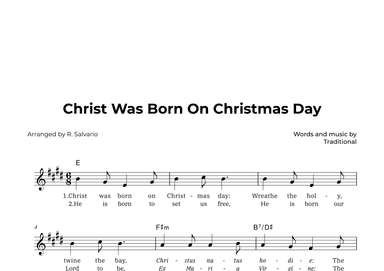 C Instrument - Digital Download SKU: A0.1307996 By Traditional. By Traditional. Arranged by R. Salvario. Christmas,Multicultural,Praise & Worship,Sacred,Traditional,World. Lead Sheet / Fake Book. 1 pages. Brambilla-Morris Press #897273. Published by Brambilla-Morris Press (A0.1307996). Christ Was Born On Christmas Day (Key of E Major)This is an arrangement for the song Christ Was Born On Christmas Day; you will love how it sounds! You will get the individual part when you download the PDF. This product was created by a member of ArrangeMe, Hal Leonard’s global self-publishing community of independent composers, arrangers, and songwriters. ArrangeMe allows for the publication of unique arrangements of both popular titles and original compositions from a wide variety of voices and backgrounds. About Digital Downloads Digital Downloads are downloadable sheet music files that can be viewed directly on your computer, tablet or mobile device. Once you download your digital sheet music, you can view and print it at home, school, or anywhere you want to make music, and you don’t have to be connected to the internet. Just purchase, download and play! PLEASE NOTE: Your Digital Download will have a watermark at the bottom of each page that will include your name, purchase date and number of copies purchased. You are only authorized to print the number of copies that you have purchased. You may not digitally distribute or print more copies than purchased for use (i.e., you may not print or digitally distribute individual copies to friends or students).