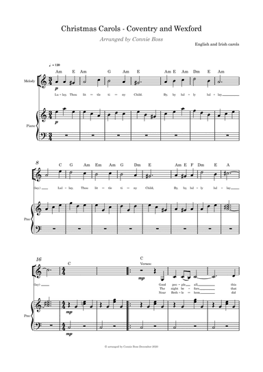 Guitar,Piano,Vocal,Voice - Level 2 - Digital Download SKU: A0.801648 Composed by Unknown. Arranged by Connie Boss. Celtic,Christmas,Irish,Sacred. Score. 4 pages. Connie Boss #6367673. Published by Connie Boss (A0.801648). This mix of a familiar English and a familiar Irish song go well together. I have them as a medley, starting with The Coventry Carol then switching to Wexford Carol and then ending with the end of The Coventry Carol. [email protected]. This product was created by a member of ArrangeMe, Hal Leonard's global self-publishing community of independent composers, arrangers, and songwriters. ArrangeMe allows for the publication of unique arrangements of popular titles and original compositions from a variety of voices and backgrounds. The length, difficulty, and retail pricing are determined solely by the discretion of the person who arranged or composed it. About Digital Downloads Digital Downloads are downloadable sheet music files that can be viewed directly on your computer, tablet or mobile device. Once you download your digital sheet music, you can view and print it at home, school, or anywhere you want to make music, and you don’t have to be connected to the internet. Just purchase, download and play! PLEASE NOTE: Your Digital Download will have a watermark at the bottom of each page that will include your name, purchase date and number of copies purchased. You are only authorized to print the number of copies that you have purchased. You may not digitally distribute or print more copies than purchased for use (i.e., you may not print or digitally distribute individual copies to friends or students).