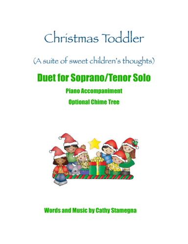 Piano,Voice Duet Piano,Voice - Level 3 - Digital Download SKU: A0.780426 Composed by Cathy Stamegna. Arranged by Cathy Stamegna. Children,Christmas,Contemporary,Holiday,Pop. 8 pages. Cathy Stamegna #4885355. Published by Cathy Stamegna (A0.780426). Christmas Toddler (Soprano/Tenor Duet, Optional Chime Tree, Piano Accompaniment). A four-minute suite portraying a humorous glimpse of Christmas through the eyes of a toddler: Dear Santa, could you come through the front door? You make such a mess in the fireplace! Other Vocal Arrangements and Piano Accompaniment Track available. This product was created by a member of ArrangeMe, Hal Leonard's global self-publishing community of independent composers, arrangers, and songwriters. ArrangeMe allows for the publication of unique arrangements of popular titles and original compositions from a variety of voices and backgrounds. The length, difficulty, and retail pricing are determined solely by the discretion of the person who arranged or composed it. About Digital Downloads Digital Downloads are downloadable sheet music files that can be viewed directly on your computer, tablet or mobile device. Once you download your digital sheet music, you can view and print it at home, school, or anywhere you want to make music, and you don’t have to be connected to the internet. Just purchase, download and play! PLEASE NOTE: Your Digital Download will have a watermark at the bottom of each page that will include your name, purchase date and number of copies purchased. You are only authorized to print the number of copies that you have purchased. You may not digitally distribute or print more copies than purchased for use (i.e., you may not print or digitally distribute individual copies to friends or students).