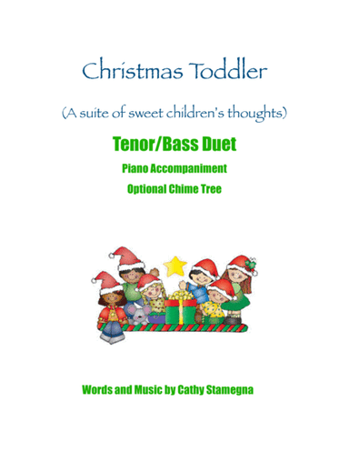 Piano,Voice Duet Piano,Voice - Level 3 - Digital Download SKU: A0.780424 Composed by Cathy Stamegna. Arranged by Cathy Stamegna. Children,Christmas,Contemporary,Holiday,Pop. 8 pages. Cathy Stamegna #4885119. Published by Cathy Stamegna (A0.780424). Christmas Toddler (TB Duet, Optional Chime Tree, Piano Accompaniment). A four-minute suite portraying a humorous glimpse of Christmas through the eyes of a toddler: Dear Santa, could you come through the front door? You make such a mess in the fireplace! Other Vocal Arrangements and Piano Accompaniment Track available. This product was created by a member of ArrangeMe, Hal Leonard’s global self-publishing community of independent composers, arrangers, and songwriters. ArrangeMe allows for the publication of unique arrangements of both popular titles and original compositions from a wide variety of voices and backgrounds. About Digital Downloads Digital Downloads are downloadable sheet music files that can be viewed directly on your computer, tablet or mobile device. Once you download your digital sheet music, you can view and print it at home, school, or anywhere you want to make music, and you don’t have to be connected to the internet. Just purchase, download and play! PLEASE NOTE: Your Digital Download will have a watermark at the bottom of each page that will include your name, purchase date and number of copies purchased. You are only authorized to print the number of copies that you have purchased. You may not digitally distribute or print more copies than purchased for use (i.e., you may not print or digitally distribute individual copies to friends or students).