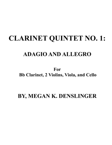 Small Ensemble Cello,Clarinet,Double Bass,Viola,Violin - Level 4 - Digital Download SKU: A0.993761 Composed by Megan K. Denslinger. 20th Century,Concert,Contemporary. Score and parts. 65 pages. Megan K. Denslinger #4320929. Published by Megan K. Denslinger (A0.993761). Composed in August 2018, this single movement quintet is a modern adaptation of a clarinet and string quintet. The pure inspiration behind this work is the desire to write a quintet for clarinet and strings. Harmonic rhythm and harmonies were inspired from many of Mozart’s clarinet and string quintets.  This product was created by a member of ArrangeMe, Hal Leonard’s global self-publishing community of independent composers, arrangers, and songwriters. ArrangeMe allows for the publication of unique arrangements of both popular titles and original compositions from a wide variety of voices and backgrounds. About Digital Downloads Digital Downloads are downloadable sheet music files that can be viewed directly on your computer, tablet or mobile device. Once you download your digital sheet music, you can view and print it at home, school, or anywhere you want to make music, and you don’t have to be connected to the internet. Just purchase, download and play! PLEASE NOTE: Your Digital Download will have a watermark at the bottom of each page that will include your name, purchase date and number of copies purchased. You are only authorized to print the number of copies that you have purchased. You may not digitally distribute or print more copies than purchased for use (i.e., you may not print or digitally distribute individual copies to friends or students).